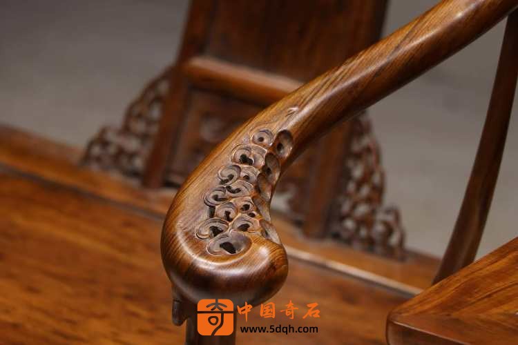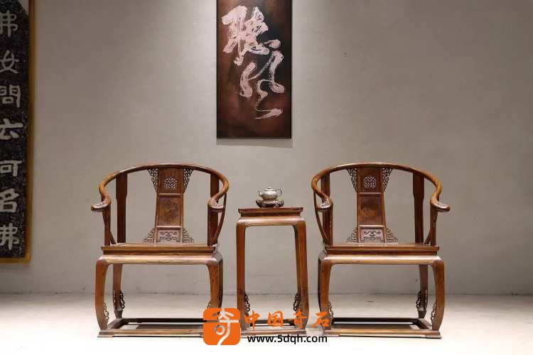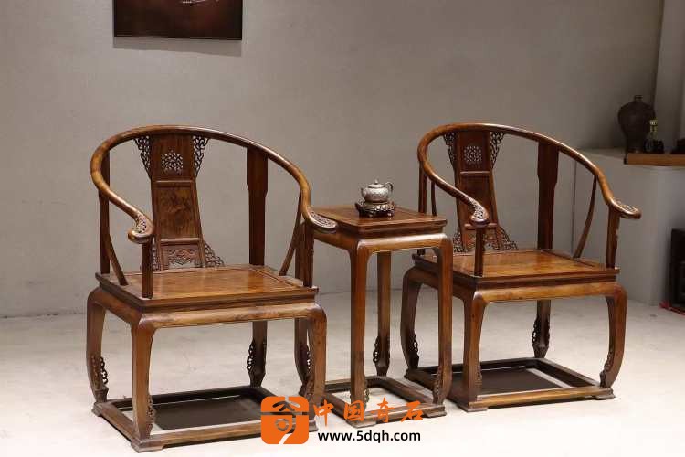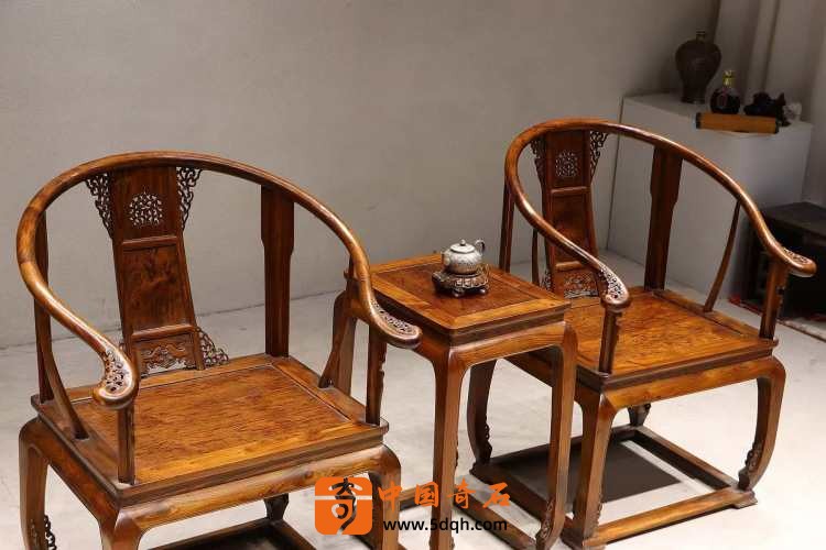 黄花梨皇宫椅三件套整体器形庄重大气,座面宽大,用料考究,可置雅室。