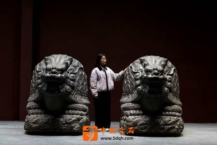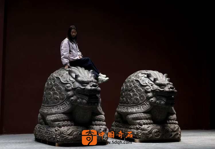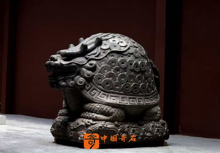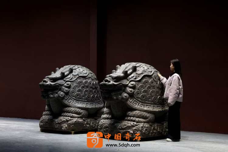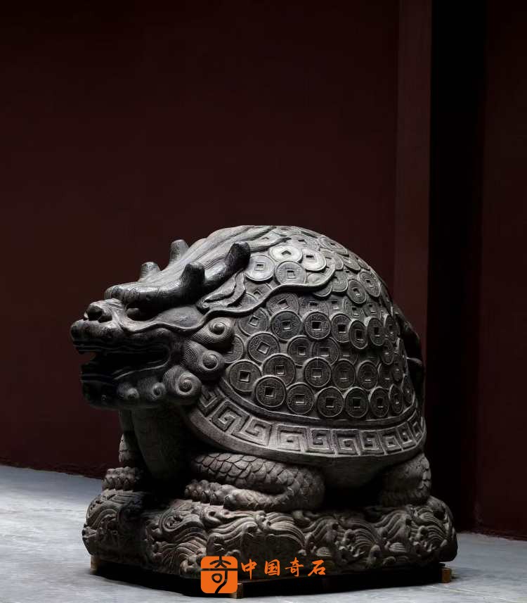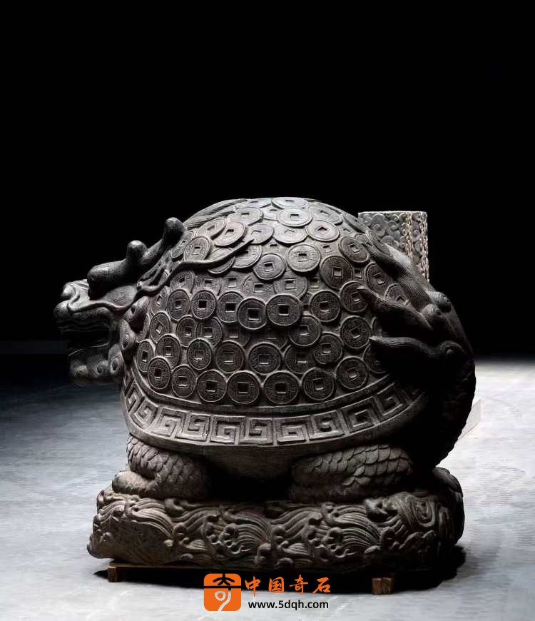 清代青石石雕·成对金钱龟奇石龟体型硕大 龙头龟身 满身刻铜钱纹 蹲坐于海水纹石台之上 全品相 可置于庭院会所摆放有招财进宝纳福之寓意。