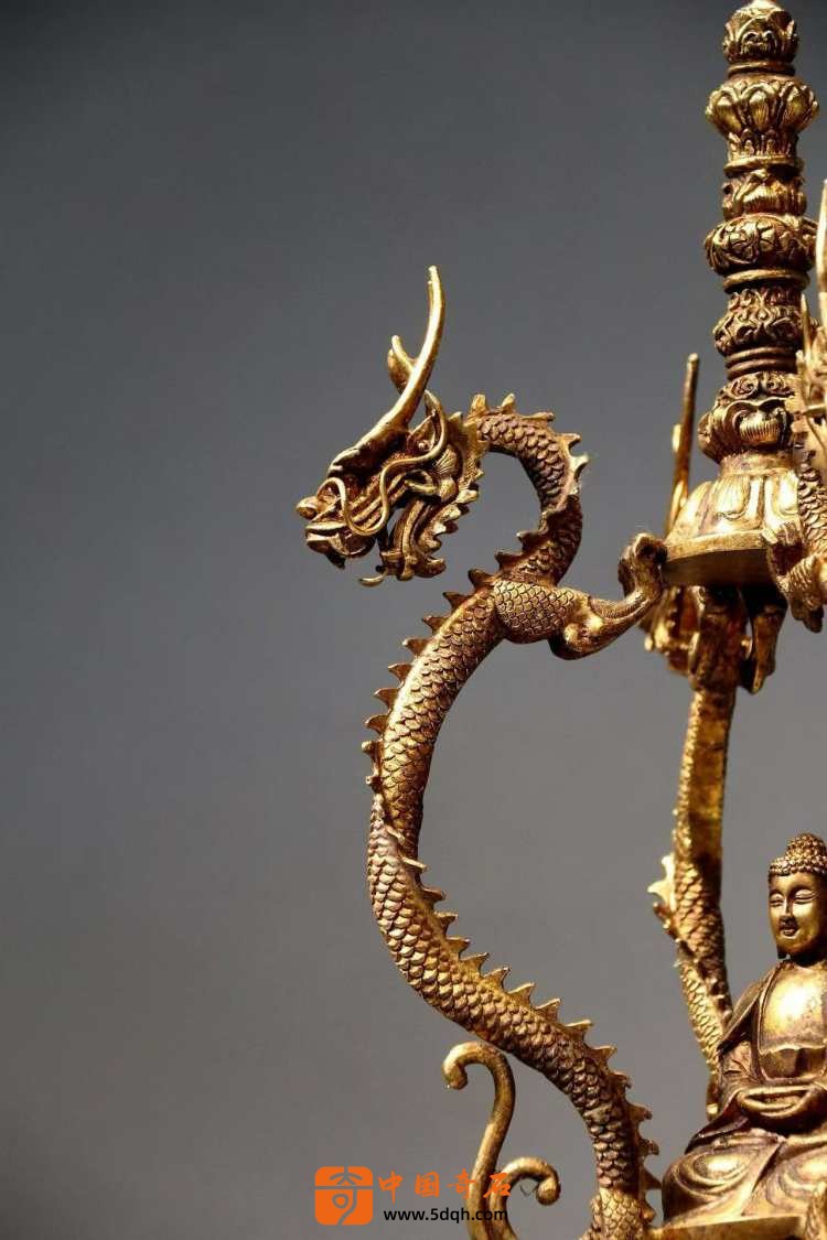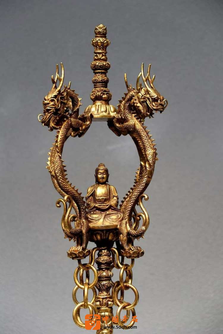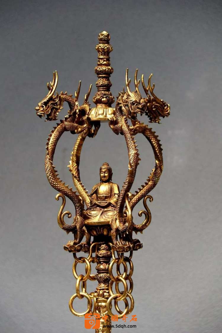 四股十二环鎏金·龙头禅杖此禅杖四股十二环高185厘米, 佛像双手结实端坐莲花座开脸慈祥,杖身通体鎏金、龙头立体生动,鳞片层次分明,极为罕见。是佛教界最高权威的象征,有极高的收藏和佛教文化研究价值。