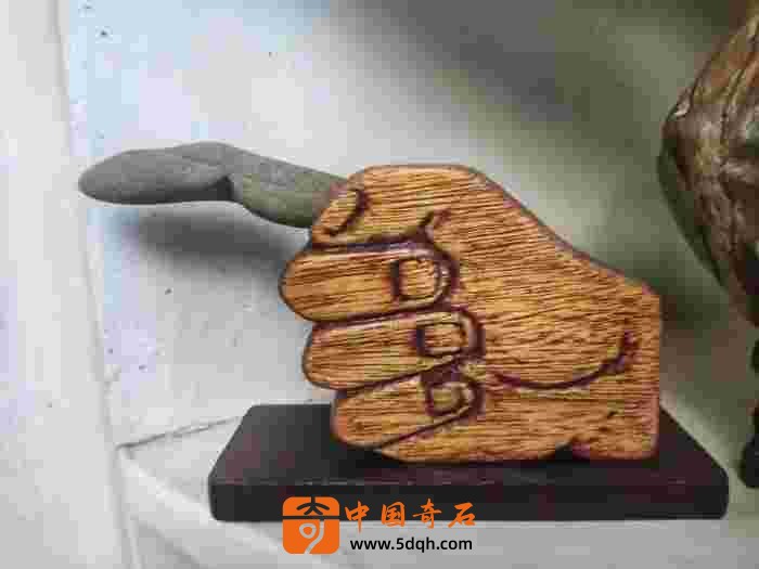 一次机缘巧合,陈冰捡到一块条状奇石,手指关节、弯曲程度都非常像人类的手指,陈冰专门雕刻了一只握拳的木手,并且在旁边搭配一块人脸石,取名“仙人指路”。