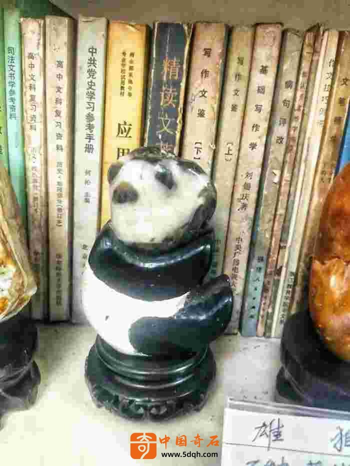 他的客厅里还摆放着一块黑白相间的熊猫石,熊猫的耳朵、眼睛等轮廓非常清晰,陈冰为其配上身体,涂上黑白油漆,奇石加上木质身体,看上去就像是一只活灵活现的熊猫。
