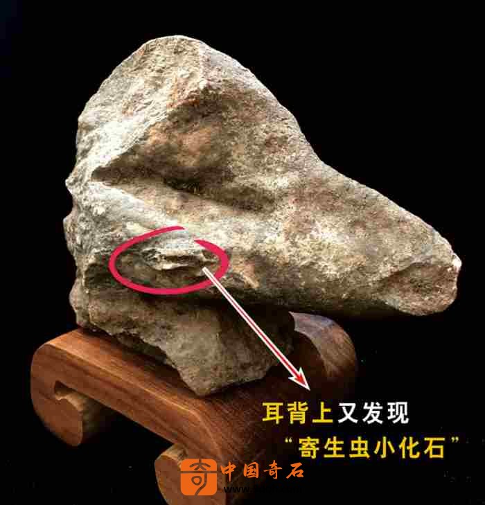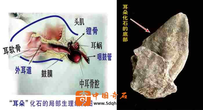 中华第一耳奇石,是著名学者黄锦祥偶然发现的奇石,距今约亿万年历史,是恐龙类古生物右耳化石,别称“龙耳”。耳朵生理结构完整,呈灰黄褐色。此耳奇趣无穷,惹人喜爱!总长约18厘米,高12厘米,厚10厘米,重1350克(1.35公斤)。耳壳美观完整,毛孔清晰可见,耳廓软骨突显延伸耳洞,外耳道深入鼓膜处,颅侧断裂处见镫骨和咽鼓管。耳道长13.8厘米(呈锥形),耳壁厚实,耳根肌肉肥厚,肌肤纹理可辨,是世界上颇为珍稀的肉质化石。