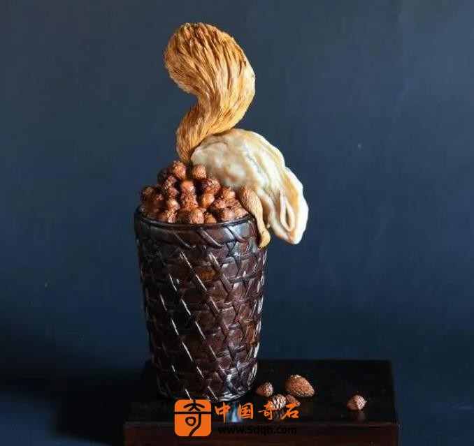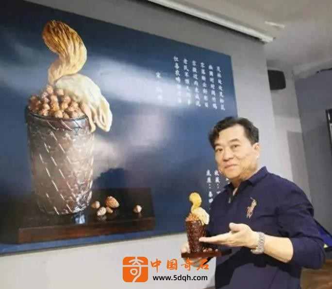 比如,正在本届沪太赏石文化博览会上展出的“松鼠戏果”,是一方玛瑙石,原来仅有5厘米左右,米黄色,弧形弓背,仿佛一只小松鼠的身体,头上长着凤眼。秦明兴为之一振,亲自设计了底座,配置了松鼠尾巴和直立桶式木几架,整个作品让人惊叹不已。