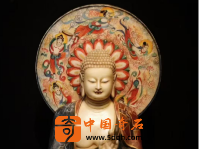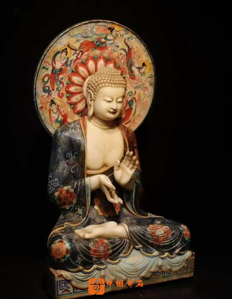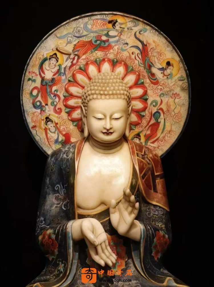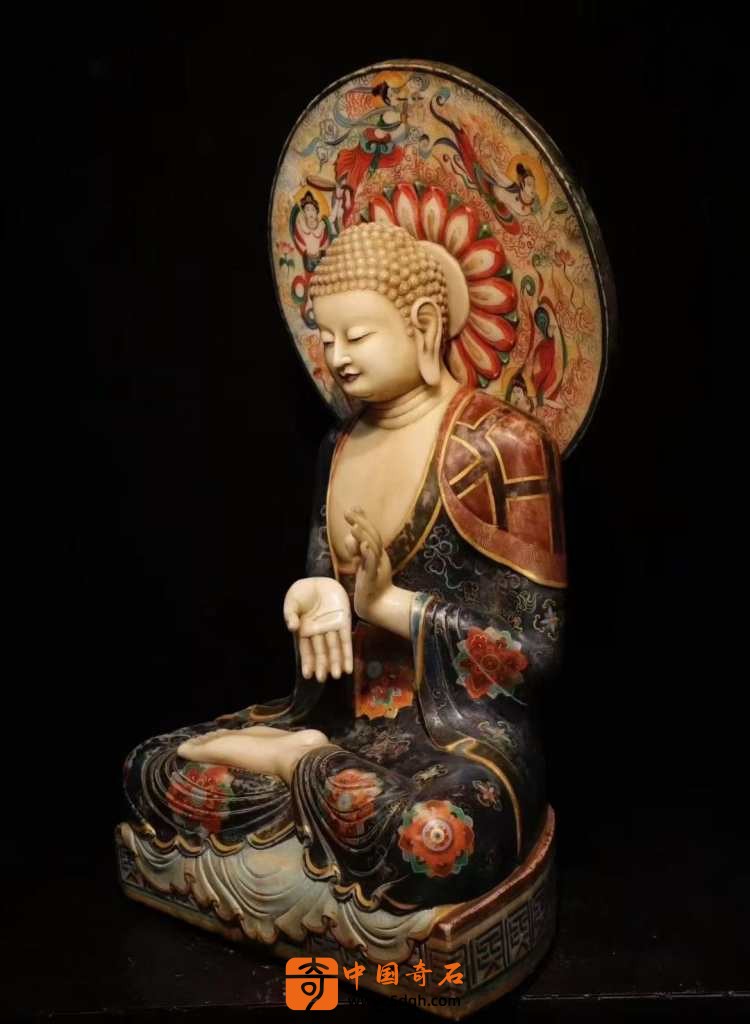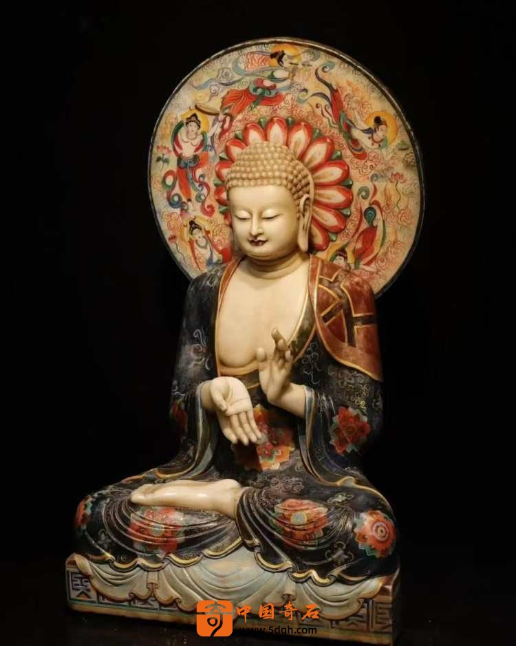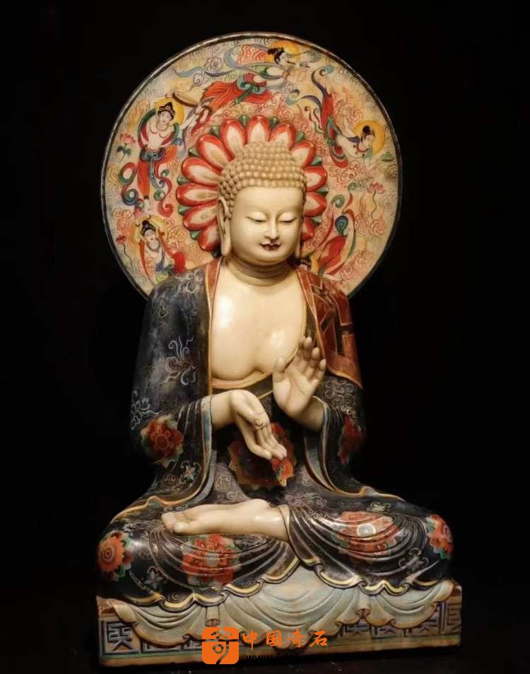 唐韵 汉白玉彩绘 释迦摩尼佛像,佛像开脸端庄,法相庄严,头戴背光,周身描金彩绘,飞天人物题材少见。